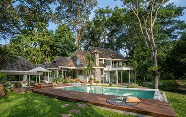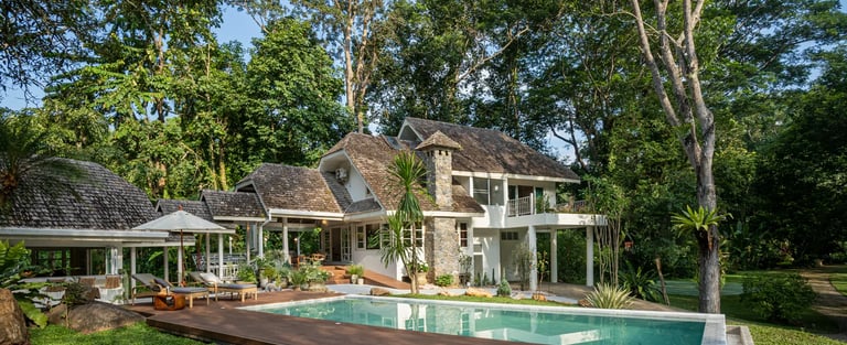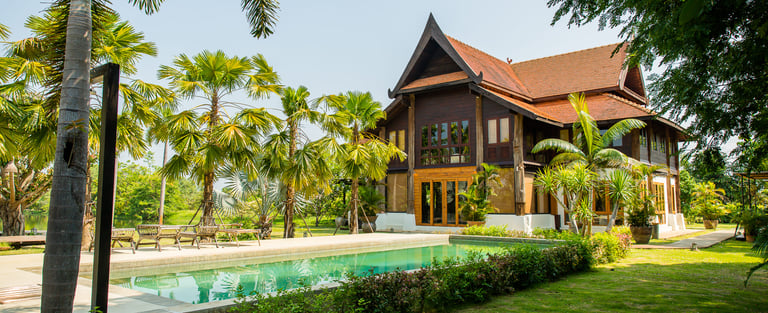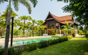 a stunning private villa set within lush tropical gardens, offering a serene and intimate atmosphere perfect for weddings and special celebrations. The architecture features elegant Thai-inspired wooden design with high gabled roofs and warm natural tones, creating a timeless and sophisticated charm.